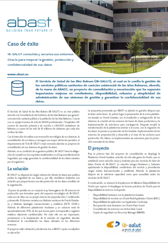 El Servicio de Salud de las Illes Balears (IB-SALUT), al cual se le confía la gestión de los servicios públicos sanitarios de carácter asistencial de las Islas Baleares, abordó, de la mano de ABAST, un proyecto de consolidación y securización que ha supuesto importantes mejoras en rendimiento, disponibilidad, robustez y simplicidad de administración de sus sistemas de gestión y garantizar la confidencialidad de sus datos.
