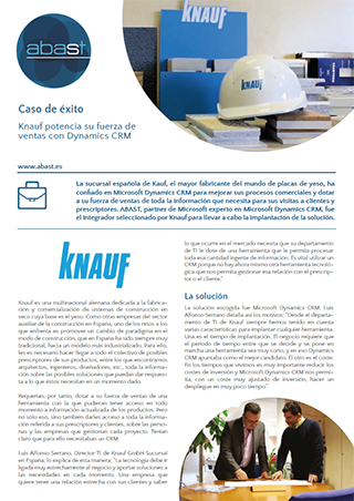 La sucursal española de Knauf, el mayor fabricante del mundo de placas de yeso, ha confiado en Microsoft Dynamics CRM para mejorar sus procesos comerciales y dotar a su fuerza de ventas de toda la información que necesita para sus visitas a clientes y prescriptores. ABAST, partner de Microsoft experto en Microsoft Dynamics CRM, fue el integrador seleccionado por Knauf para llevar a cabo la implantación de la solución.