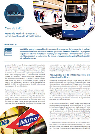 ABAST ha sido el responsable del proyecto de renovación del entorno de virtualización Linux basado en infraestructura HPE y VMware de Metro de Madrid. Un proyecto adjudicado a través de licitación pública y que ha permitido a Metro mejorar la capacidad de proceso de la plataforma, dar cabida a nuevos servicios y simplificar la gestión de todo el entorno.