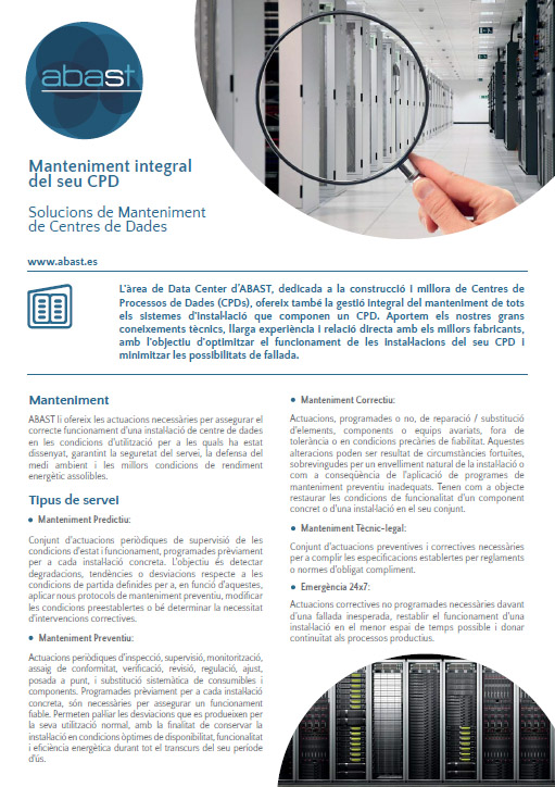 ABAST le ofrece las actuaciones necesarias para asegurar el correcto funcionamiento de una instalación de centro de datos en las condiciones de utilización para las que ha sido diseñado, garantizando la seguridad del servicio, la defensa del medio ambiente y las mejores condiciones de rendimiento energético alcanzables.
