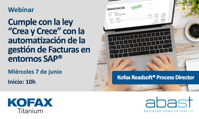ABAST le invita a este webinar que tratará sobre cómo automatizar y optimizar procesos financieros como los de cuentas a pagar con soluciones Kofax certificadas por SAP, que le permitirán impulsar la productividad, reducir costes, aumentar la precisión y visibilidad de los datos y mejorar las relaciones con proveedores y clientes, además cumpliendo con la nueva normativa.