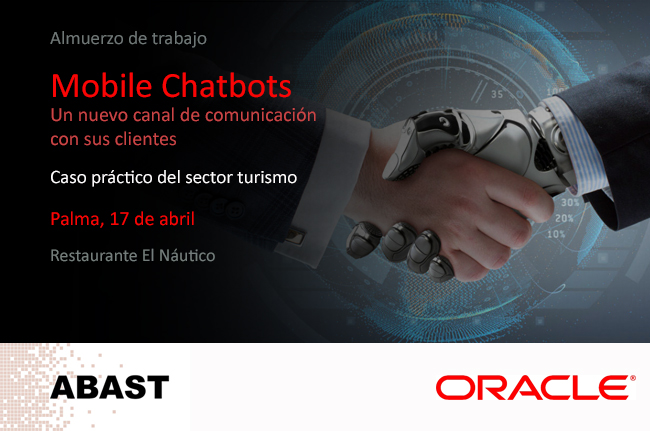 Desde ABAST y Oracle queremos invitarle a asistir a este evento en el que explicaremos cómo Oracle Mobile Cloud permite crear de forma sencilla chatbots que se integran con las principales apps de mensajería instantánea. Veremos el caso práctico de Grupo Piñero, que explicará cómo ha puesto en marcha un servicio de chatbot para gestionar las reservas de restaurantes en sus resorts, y también otros ejemplos de uso que pueden resultar de aplicación en su organización. Una gran oportunidad para desarrollar una ventaja competitiva dentro de la estrategia de transformación digital de su compañía.