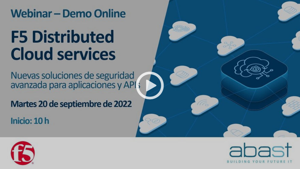 Te invitamos a un webinar de ABAST y F5 en el que te explicaremos y mostraremos en una DEMO, las ventajas de F5 Distributed Cloud Services, un conjunto de servicios de seguridad, redes y gestión de aplicaciones en modo SaaS que permiten a las organizaciones proteger, desplegar y operar sus aplicaciones dondequiera que sea necesario: data centers, entornos cloud o multi-cloud o el edge de la red o de la empresa.