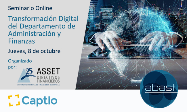El próximo 8 de octubre, ASSET, Asociación Española de Financieros de Empresa, organiza un seminario financiero online que contará con la participación de ABAST y Captio donde hablaremos de digitalización, automatización y movilidad aplicada a procesos administrativos y finanzas. Daremos a conocer las características y ventajas de dos soluciones que permitirán dar un paso adelante en la Transformación Digital del Departamento Financiero: