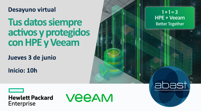 Desde ABAST, Platinum Partner de HPE y Gold Partner de Veeam, queremos invitarte a un desayuno virtual que celebraremos el próximo 3/6/21 y en el que daremos a conocer las novedades de la oferta combinada de soluciones Veeam y HPE para garantizar la total protección de tus datos y la disponibilidad de tus cargas de trabajo sea cual sea el modelo de tus entornos TI (físicos, virtuales, cloud o híbridos). Soluciones que aseguran que tu organización pueda recuperarse de una forma fácil y rápida en caso de un incidente como un error humano o un ataque malicioso.