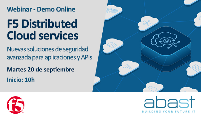 Te invitamos a un webinar de ABAST y F5 en el que te explicaremos y mostraremos en una DEMO, las ventajas de F5 Distributed Cloud Services, un conjunto de servicios de seguridad, redes y gestión de aplicaciones en modo SaaS que permiten a las organizaciones proteger, desplegar y operar sus aplicaciones dondequiera que sea necesario: data centers, entornos cloud o multi-cloud o el edge de la red o de la empresa