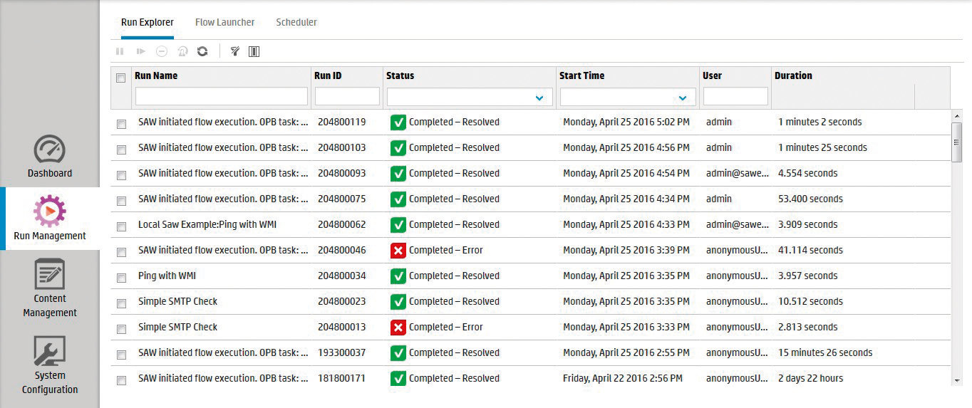 Operations Orchestration dispone de una consola de gestión que le permite ver el estado de sus ejecuciones y el resultado de las mismas.