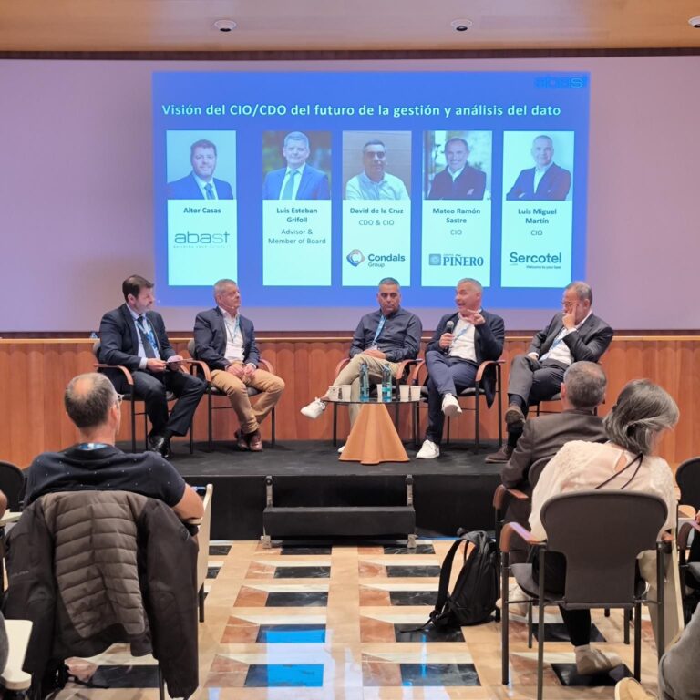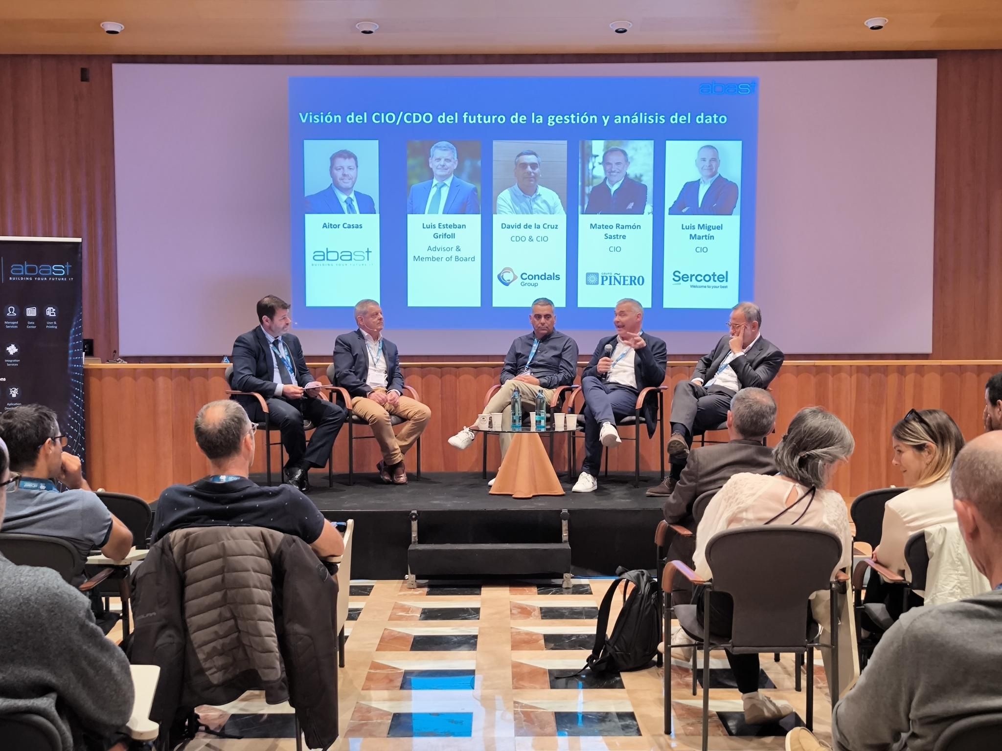 Después del coffee break, llegó uno de los momentos más esperados de la jornada, la mesa redonda de CIOs y CDOs, , moderada por Aitor Casas, Business director de Data Services & Innovation en Abast, en la que participaron David de la Cruz, CDO de Condals Group; Luis Miguel Martín Montes, CIO de Sercotel Hotel Group; Mateo Ramón Sastre, CIO de Grupo Piñero; y Luis Esteban Grifoll, Advisor & member of Board, con experiencia como CDO en una gran entidad bancaria.