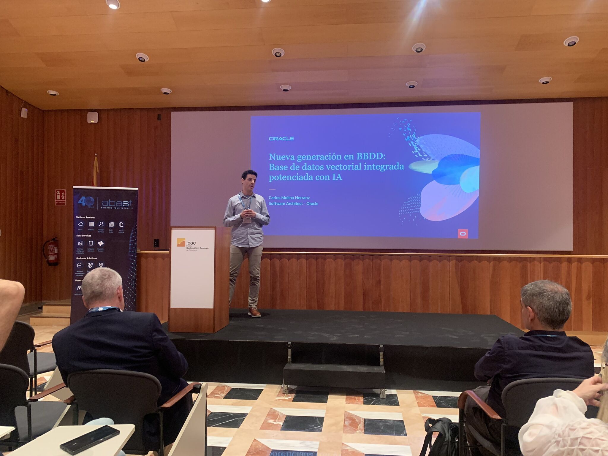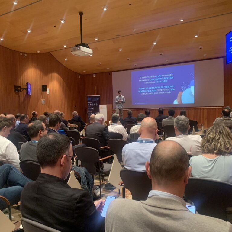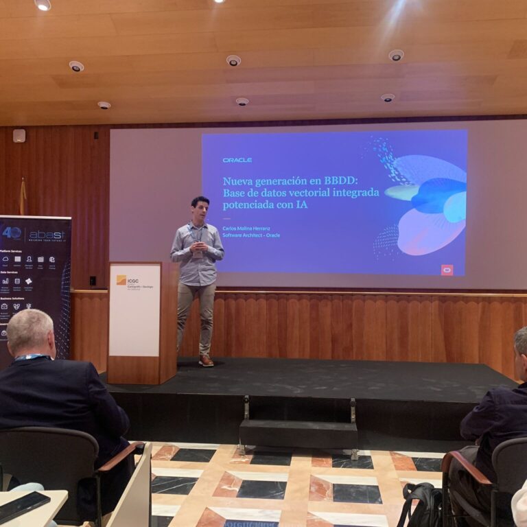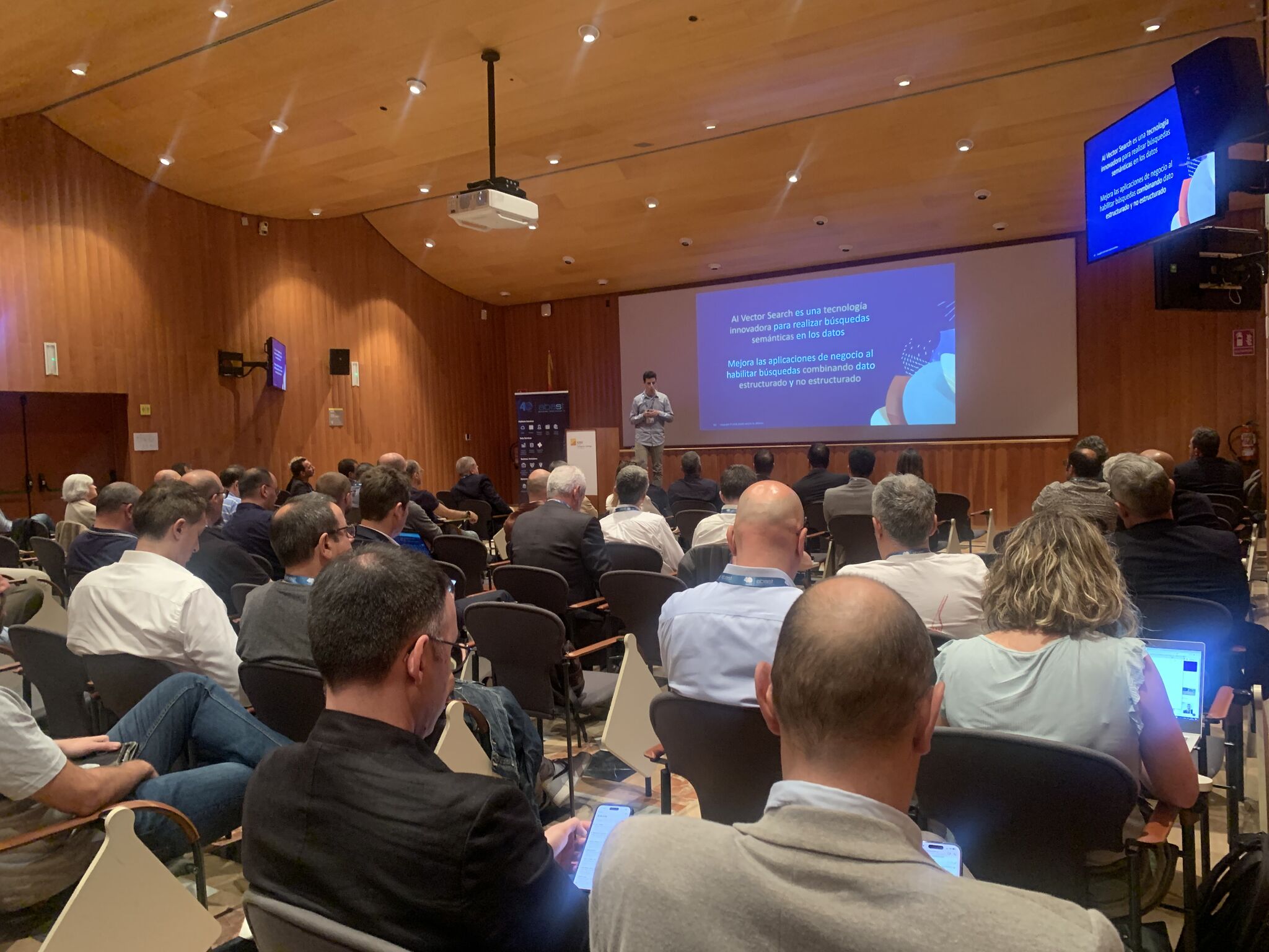 La jornada continuó con la ponencia de Carlos Molina Herranz, Technology Sales Architect en Oracle Iberia, quien presentó una visión innovadora sobre cómo la inteligencia artificial está transformando la gestión de bases de datos. Hizo un repaso sobre el rol de las bases de datos vectoriales y cómo éstas están permitiendo abrir nuevas posibilidades en la explotación del dato. La búsqueda por vectores, explicó, es una tecnología innovadora para realizar búsquedas semánticas en los datos. Esto mejora las aplicaciones de negocio al habilitar búsquedas que pueden combinar tanto datos estructurados como no estructurados. Según Carlos Molina, la tecnología de Oracle para bases de datos está lista para responder a las demandas de la era digital y está en constante evolución, con un enfoque especial en la integración de IA directamente en los sistemas de gestión de datos.