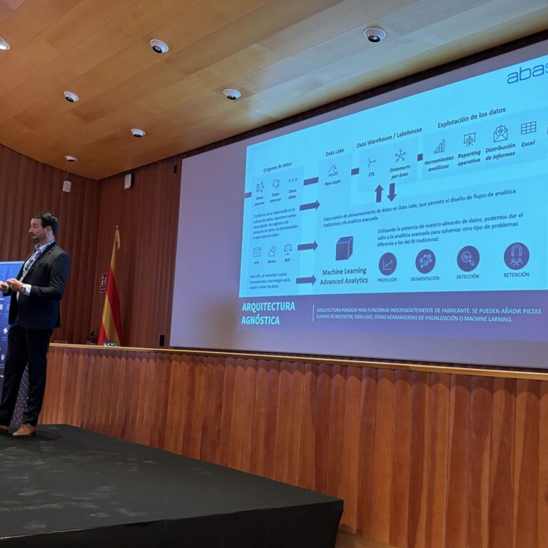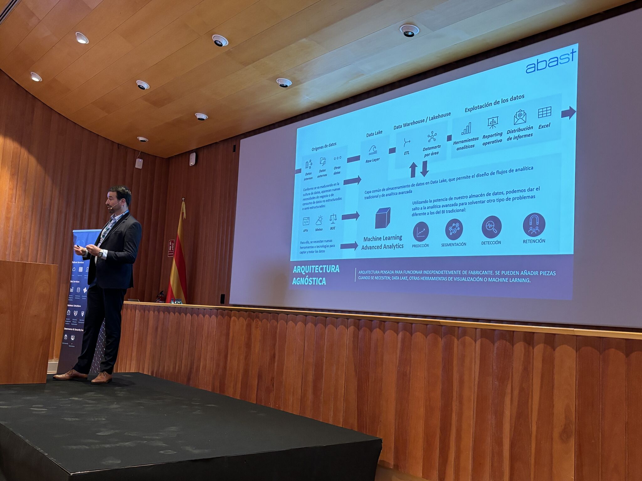 A continuación, tuvo lugar la intervención de Àlex Ginés, Business Manager de Business Intelligence & Analytics en Abast, que profundizó en cómo realizar proyectos de analítica avanzada utilizando una arquitectura agnóstica, adaptable a las necesidades específicas de cada organización. Àlex Ginés explicó que una arquitectura de este tipo permite integrar herramientas y soluciones diversas, asegurando flexibilidad y escalabilidad en el manejo de datos. Además, resaltó la importancia de escoger cuidadosamente cada componente para obtener un sistema robusto y eficiente.