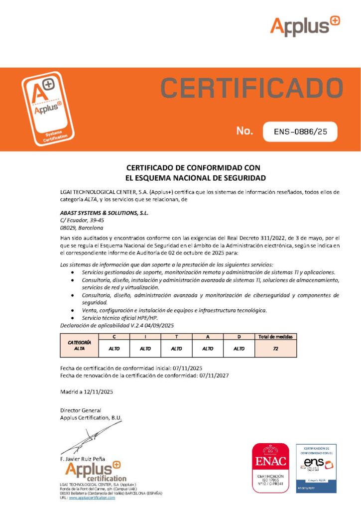 Con esta certificación, Abast refuerza su posición como socio tecnológico de referencia en ciberseguridad y gestión segura de servicios TI, alineándose con los estándares más exigentes del sector y con las mejores prácticas de cumplimiento normativo.