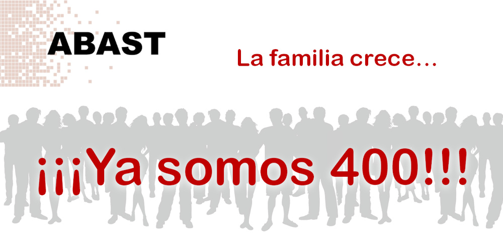 Tras las incorporaciones del último mes, la plantilla total de las empresas que forman parte del grupo ABAST supera por primera vez las 400 personas. Esto representa un incremento de aproximadamente un 25% (80 personas más) respecto a la cifra de empleados de hace dos años por estas fechas. Este aumento del personal de ABAST es una consecuencia directa de la importante evolución del volumen de negocio que la compañía ha experimentado estos últimos años.