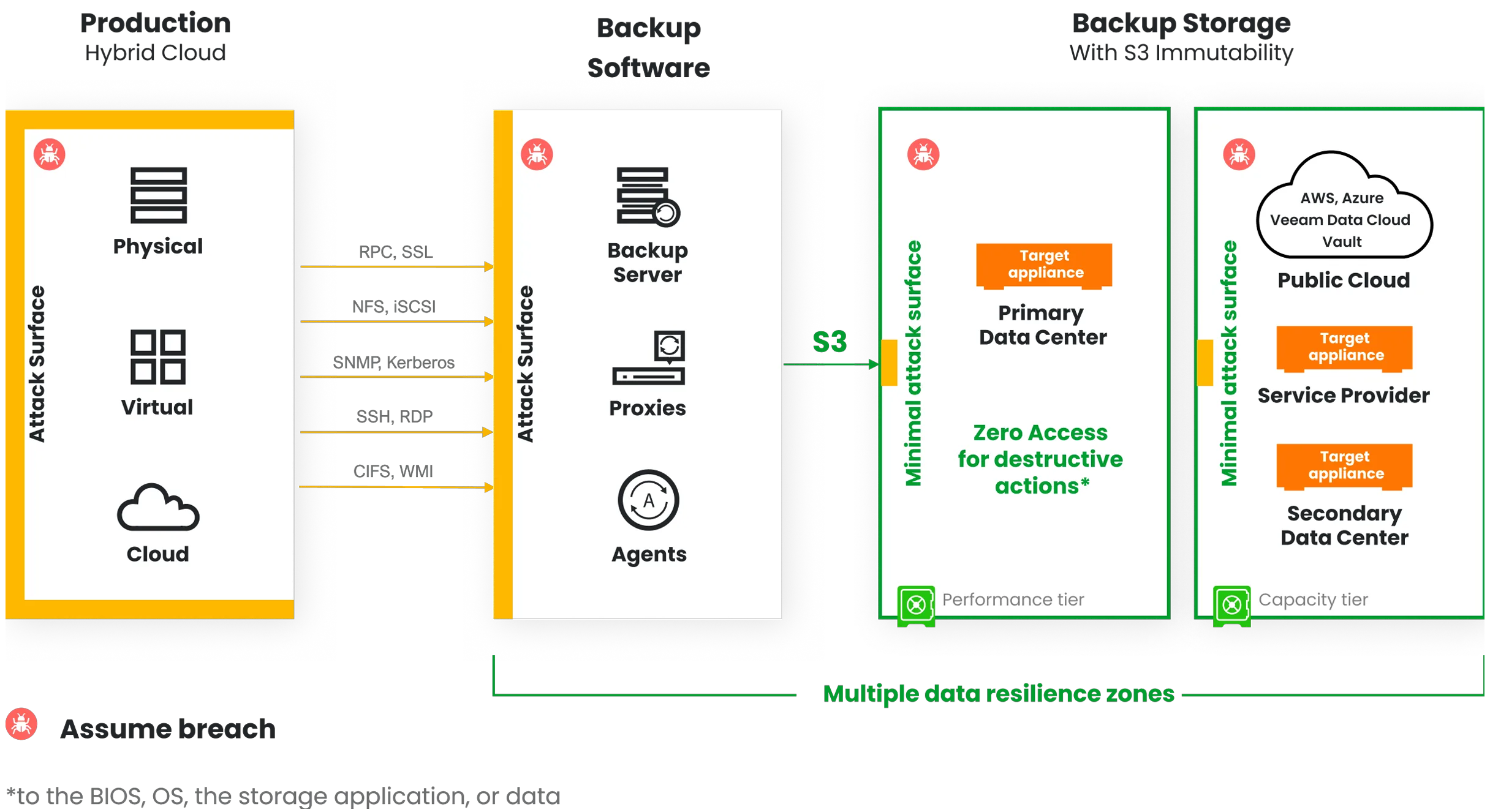 Gracias a su arquitectura ZTDR y a su formato hardened, Ootbi se mantiene completamente aislado del servidor de backup y réplicas de Veeam. Esta separación garantiza una segmentación efectiva entre las capas de software y almacenamiento, lo que refuerza la resistencia frente a ataques de ransomware.